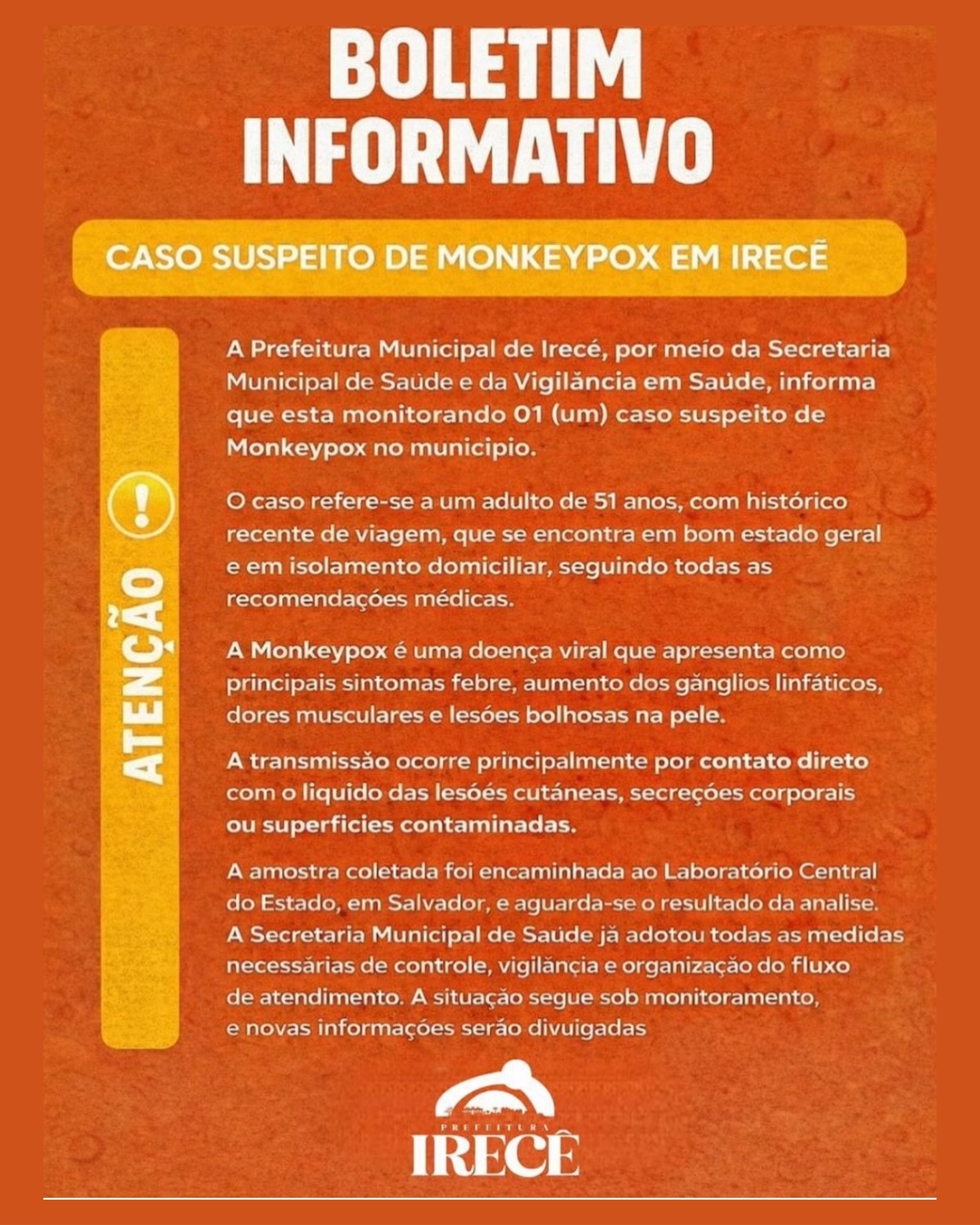 A Prefeitura de Irecê e a Secretaria Municipal de Saúde informaram que um caso suspeito de Monkeypox (Mpox) está sendo monitorado no município. O paciente apresenta bom estado geral e permanece em isolamento domiciliar, seguindo todas as orientações médicas. A amostra coletada foi encaminhada ao Laboratório Central do Estado (Lacen), e o resultado do exame está sendo aguardado.